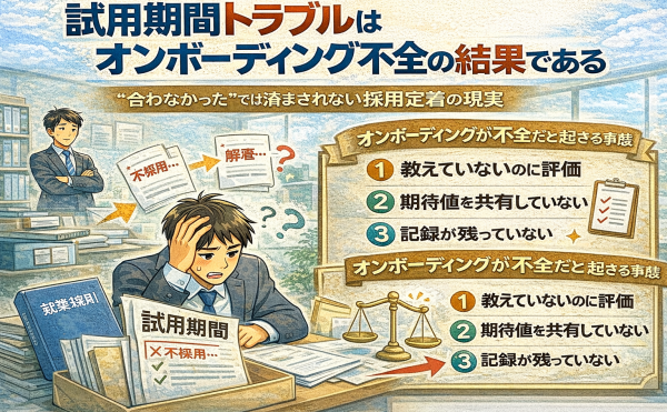 NEW 2026年4月10日社労士事務所経営者杉山からの提言杉山 晃浩 試用期間トラブルはオンボーディング不全の結果である ――「合わなかったから」では済まされない実務の現実なぜ試用期間でトラブルが後を絶たないのか 「試用期間中だから問題ないと思っていた」 これは、試用期間トラブルの相談で最も多く聞く言葉です。 試用期間中の解雇 本採用拒否 契約更新をしない判断 これらはすべて、企業側にとっ<a href="https://office-sugiyama.jp/staff_blog/staff_blog-11333/">...続きを読む</a>