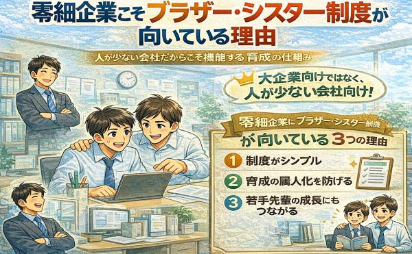NEW 2026年4月9日社労士事務所経営者杉山からの提言杉山 晃浩 零細企業こそブラザー・シスター制度が向いている理由 ――人が少ない会社だからこそ機能する育成の仕組みなぜ今、ブラザー・シスター制度が再評価されているのか 新入社員の早期離職が大きな課題となる中、 改めて注目されているのが「ブラザー・シスター制度」です。 かつては大企業の若手育成制度という印象が強く、 中小企業や零細企業<a href="https://office-sugiyama.jp/staff_blog/staff_blog-11331/">...続きを読む</a>
